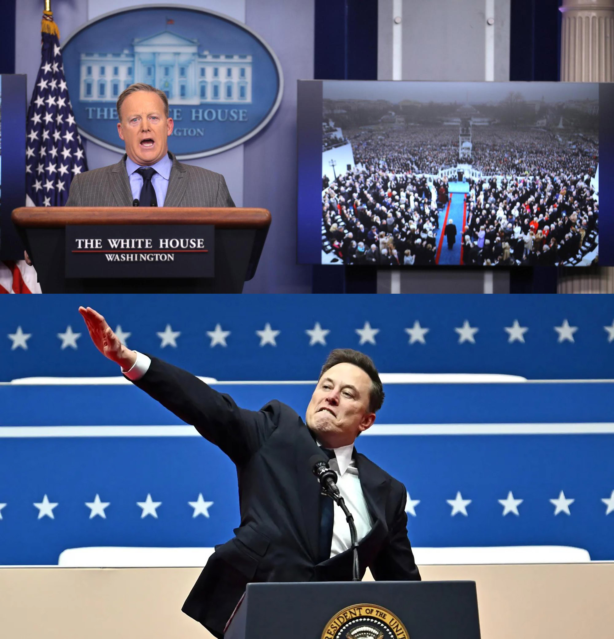 "Elon Musk streckt den rechten Arm, und alle springen drüber." (Die Zeit) Aber warum springen alle drüber? Was ist die Funktion der Hitlergruß-Debatte? Wer sich acht Jahre zurückerinnern kann, weiss noch, dass am Tag nach Trumps erster Inauguration sein Sprecher Sean Spicer bodenlose Lügen über die "crowd size" bei der Veranstaltung verbreitet hat. Auch damals sind alle drübergesprungen und haben mit derselben Akribie Besucher gezählt, mit der sie heute den Winkel von Musks Arm vermessen. Dabei geht es um etwas ganz anderes. Dass Musk keinen Hitlergruß gezeigt hätte, oder dass zu Trumps erster Amtseinführung 2017 eine Rekordbesucherzahl gekommen wäre, glaubt in Wirklichkeit niemand. Beides haben Millionen live angeschaut, und die Leute sind nicht blind. Der Zweck dieser Übung ist der Loyalitätsbeweis. Wer zu seiner ersten Pressekonferenz im Weissen Haus erscheint und verbissen eine vollkommen absurde Lügengeschichte verteidigt, der ist – genauso wie alle die, die Elon Musks offensichtlichen Hitlergruß als unbeholfene, neurodiverse Dankesgeste abtun – brauchbar für den Faschismus.